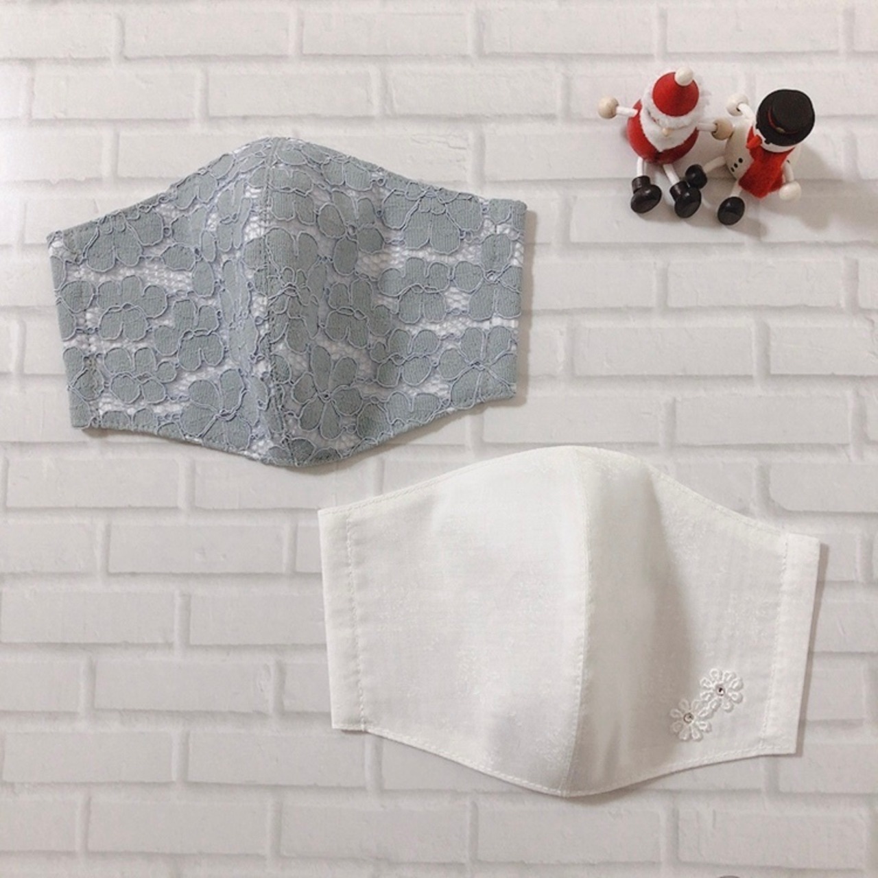 3枚合わせでお作りしているグレーチュールと、白色花柄マスク。