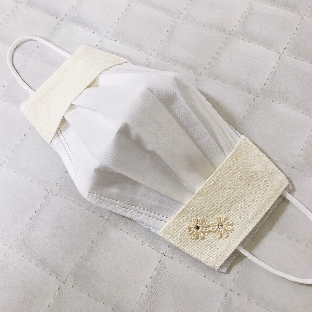オフホワイトとラベンダー柄のインナーマスクです。真っ白ではなく、オフホワイトだから、温かみもありますね♡